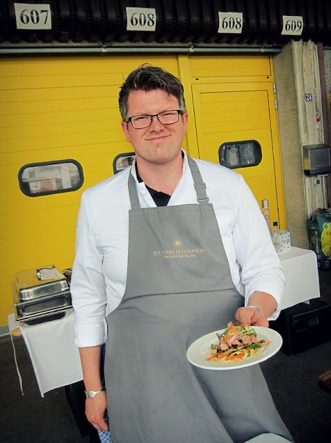 Das FrischeParadies im Essener Großmarkt an der Lützowstraße (klick hier) ist deshalb so sympathisch, weil es seine hochwertigen und frischen Waren nicht nur als Großhandel an die Gastronomie verkauft, sondern auch in einem eleganten Feinkostsupermarkt an Endverbraucher. Aus diesem vorderen Bereich kommt man als Privatkunde allerdings nicht hinaus, und so war es für den Genießer ein kleines Abenteuer, durch die den Geschäftskunden vorbehaltenen Hallen auf den hinteren Ladehof zu kommen. Dorthin hatte FrischeParadies-Leiter Christoph Wlotzki gestern seine Profikundschaft zum Big Green Egg Event geladen.