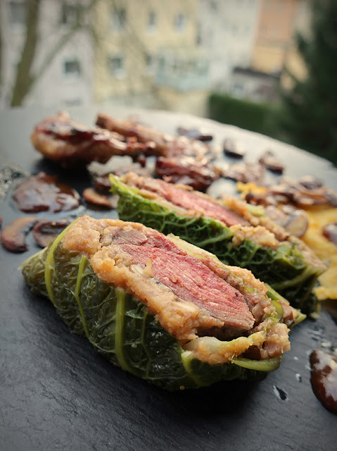 Rezept: Allerlei von Täubchen, Wirsing und Marone – Täubchenbrust im Wirsing-Maronenpüree-Mantel │ Täubchenschenkel mit Kastanienhonigglasur │ Wirsingchips │ getrüffelte Champignons │ Polenta │ Biersauce